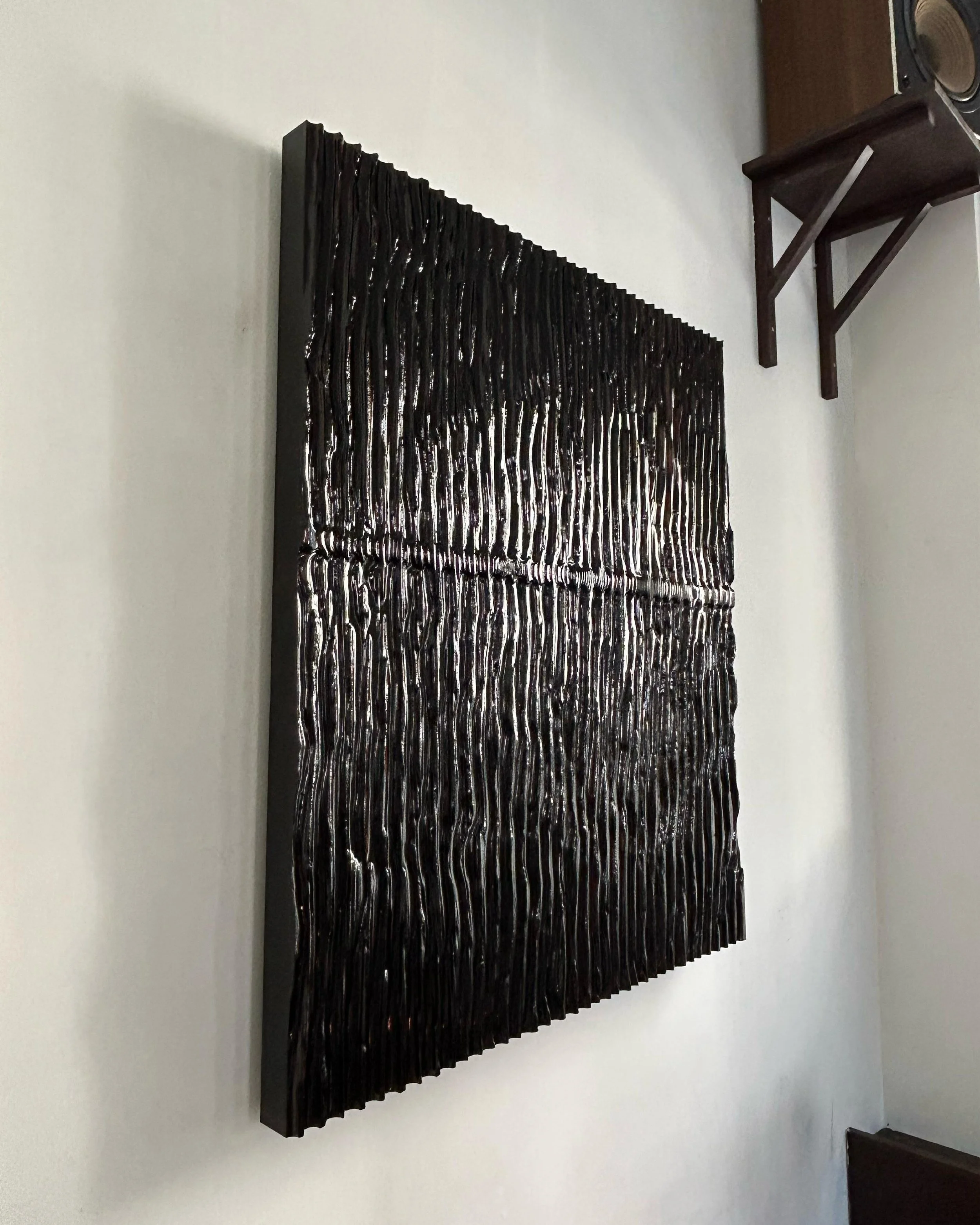 This series emerges from years of intuitive exploration in material and technique. Elias approaches wood as a malleable medium, transforming it through sculptural interventions, controlled burning, and layered lacquer applications.